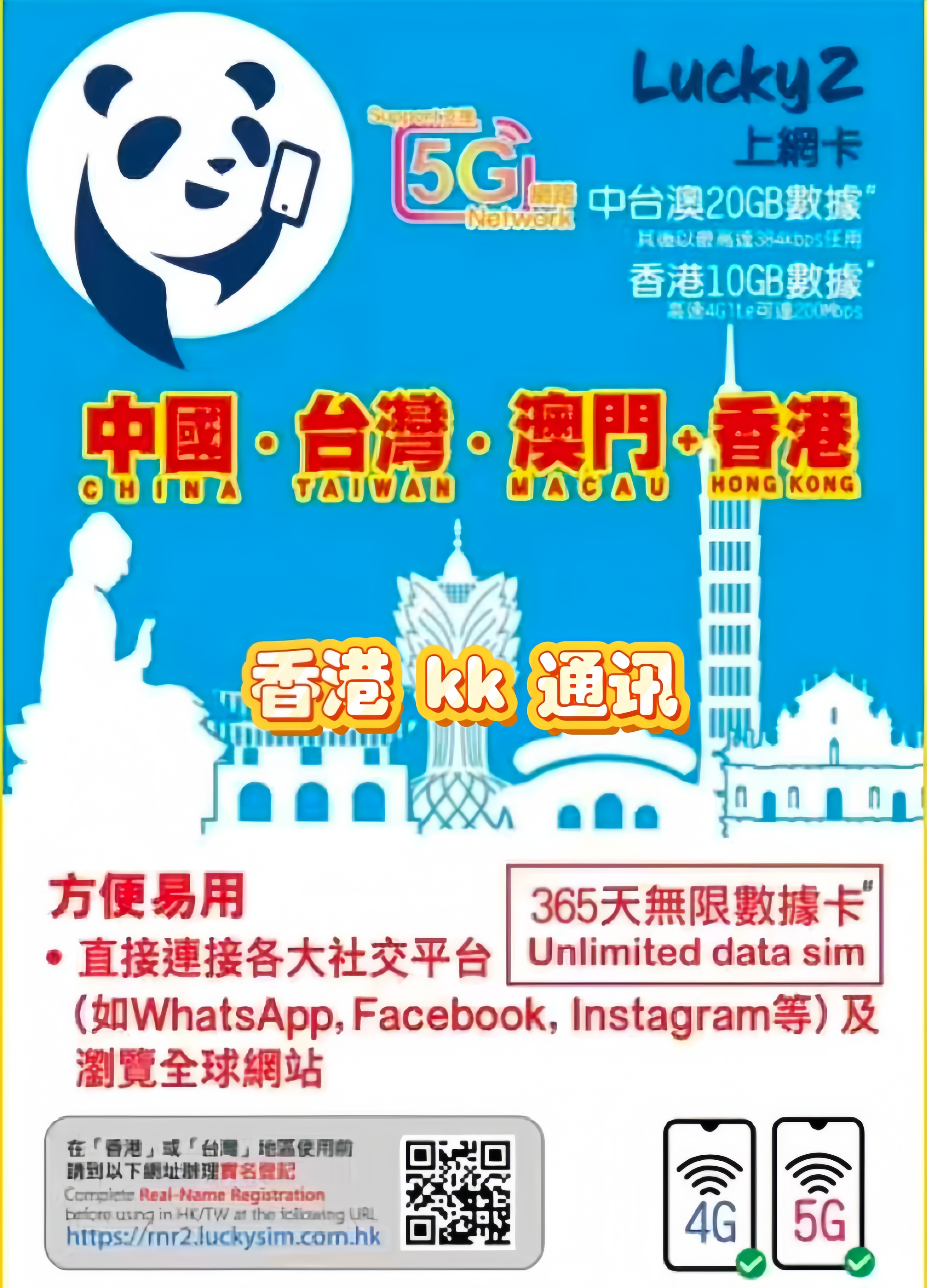 香港Lucky2熊猫20GB无限上网卡+有效期365天