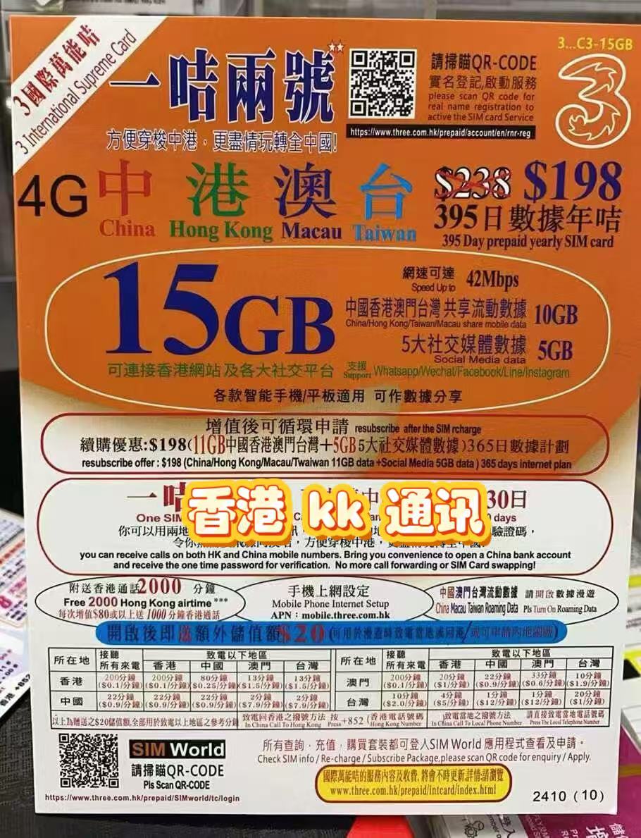 📊 面值和套餐:插卡自动激活,会有短信通知,香港本地通话2000分钟仅限香港 15G漫游内地流量数据。